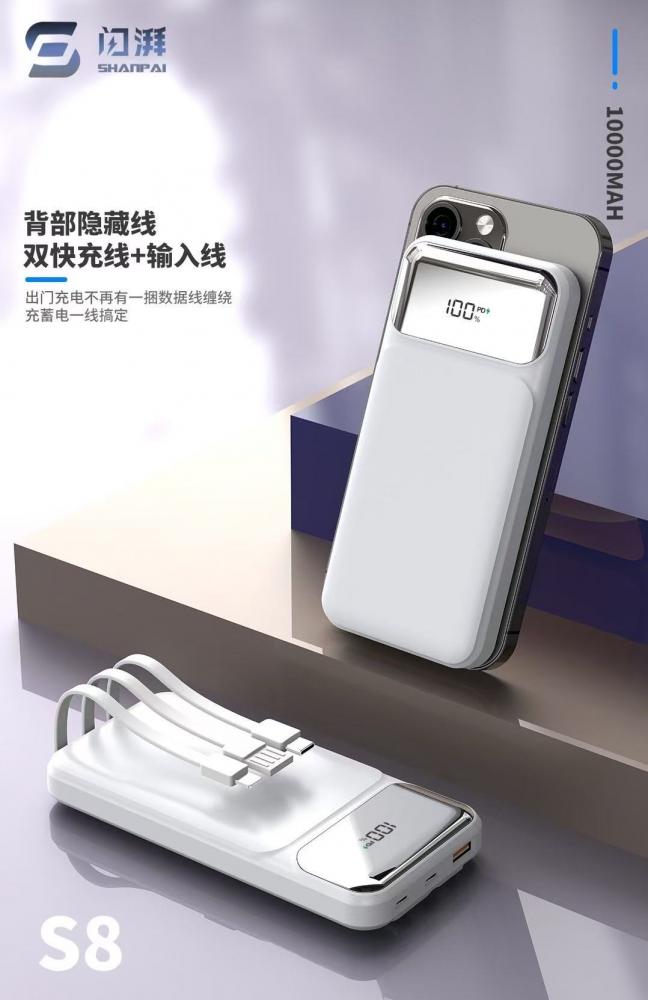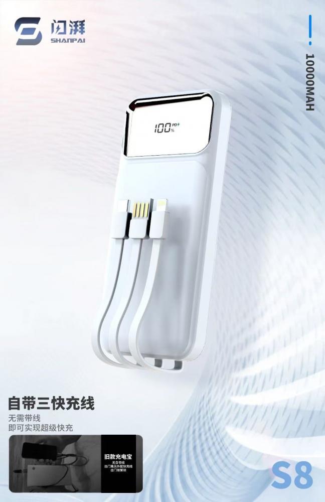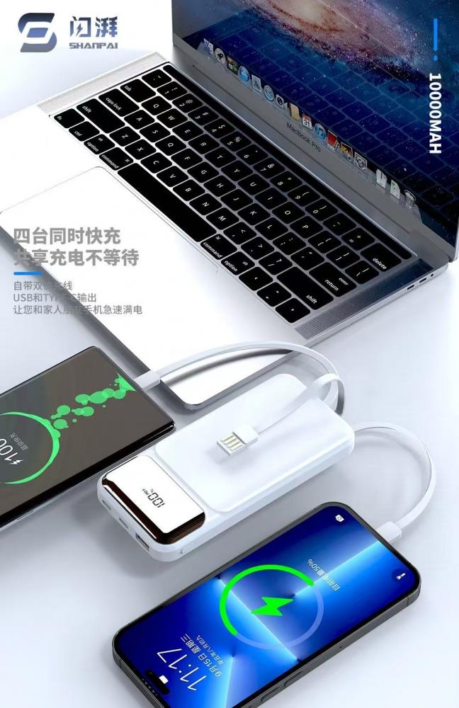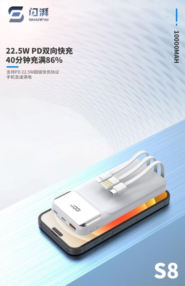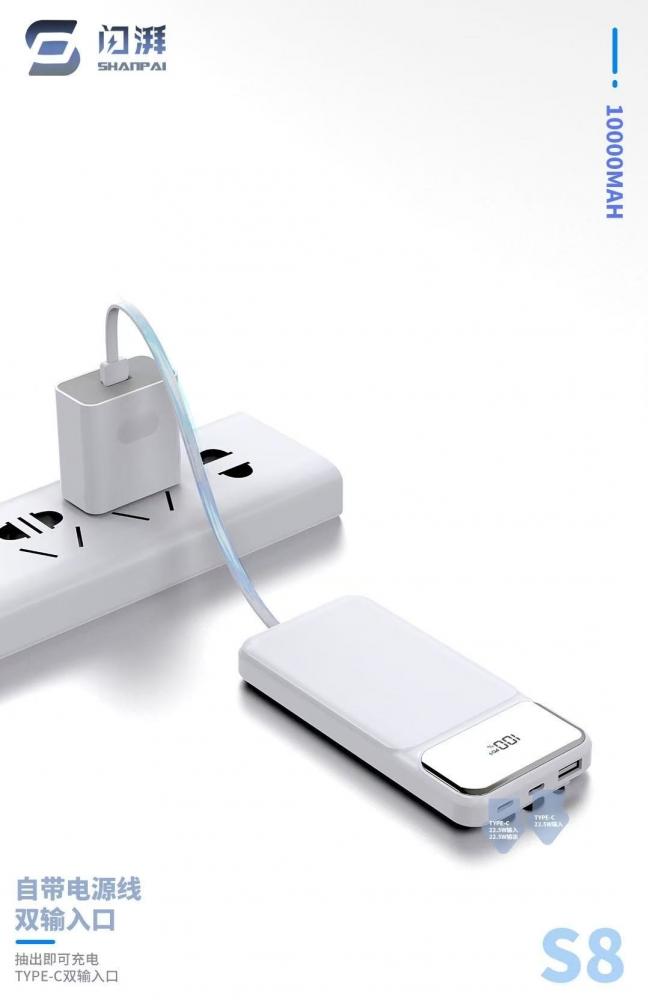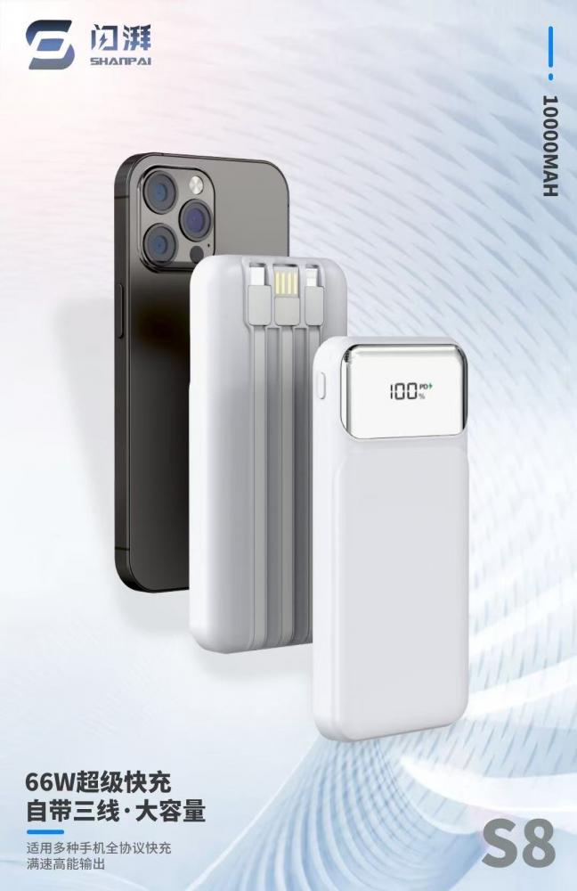 闪湃s8 10000毫安 自带三线充电宝 66w双向快充 足1万